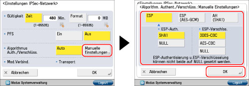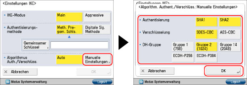 Wählen Sie [Manuelle Einstellungen] für <Algorithmus Auth./Verschlüss.> aus → Legen Sie den Authentisierungs- und Verschlüsselungsalgorithmus für IKE SA fest → Berühren Sie [OK].
