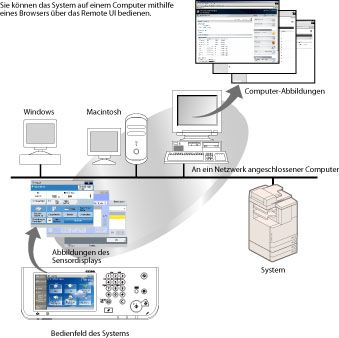 Das Remote UI (User Interface = Anwenderschnittstelle) ist eine im System vorinstallierte Software, mit der Sie über einen Webbrowser auf die Funktionen des Systems zugreifen können. Mit dem Remote UI können Sie beispielsweise auf das System zugreifen, um den Auftragsstatus zu prüfen, Aufträge auszuführen und verschiedene Einstellungen festzulegen. Damit Sie mit dem Remote UI arbeiten können, benötigen Sie lediglich einen Webbrowser und eine Netzwerkverbindung zwischen Ihrem Computer und dem System. Zur Verwendung des Remote UI müssen Sie zunächst über das Bedienfeld eine IP-Adresse (Internet Protocol) für das System eingeben und die notwendige Netzwerkverbindung einrichten.