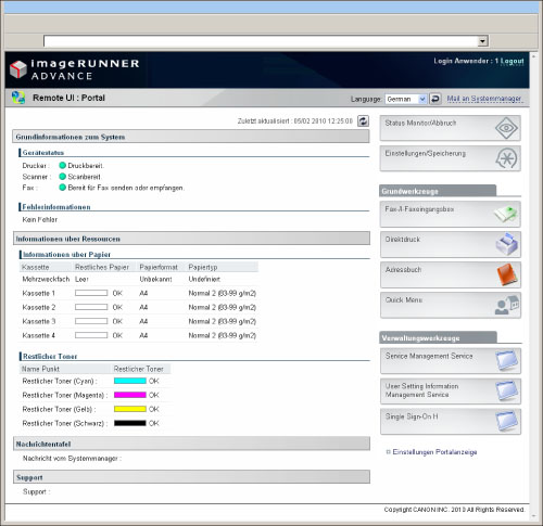 Mithilfe des Remote UI können Sie über das Netzwerk auf das System zugreifen und die Meldungen zum aktuellen Status, den Systemeinstellungen sowie zum Status aller Informationen und zur Jobverarbeitung abrufen. Sie können das System über einen Computer im selben Netzwerk verwalten und müssen die Aktionen nicht am System selbst vornehmen. Beim Aufrufen der IP-Adresse des Systems mit Ihrem Webbrowser wird folgende Startseite der Remote UI-Software auf dem Computerbildschirm angezeigt: