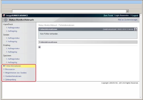 Hier werden der aktuelle Status der Einheit, z. B. Papiervorrat und Informationen zur Wartung (Verbrauchsmaterial) angezeigt.
