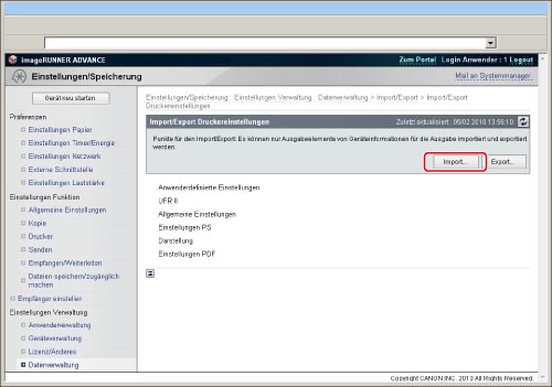 Wenn die Verwendung der Funktion <Alles importieren> Einstellungen der Verwaltung per Abteilungs ID umfasst, werden Einstellungen für den Systemmanager, wie ID und Passwort, überschrieben. Nach der Verwendung von <Alles importieren> werden die Einstellungen für den Systemmanager auf dem exportierenden System für die Anmeldung benötigt. Überprüfen Sie diese Einstellungen vor der Verwendung von <Alles exportieren>.