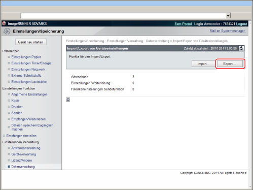 Klicken Sie auf [Einstellungen Gerät (Einstellungen Weiterleitung, Adressbuch, Favoriteneinstellungen Sendefunktion)] für <Individuell importieren/exportieren> → [Export...].