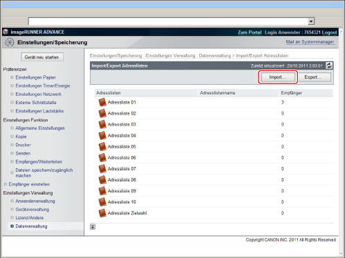 Wenn Sie eine Adressliste (Löschen und Überschreiben) oder die Weiterleitungseinstellungen importieren, werden die Informationen gelöscht, die unter [Einstellungen Favoriten] auf dem Bedienfeld eingegeben wurden und im Rückrufspeicher gespeichert sind.