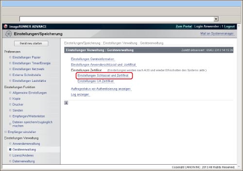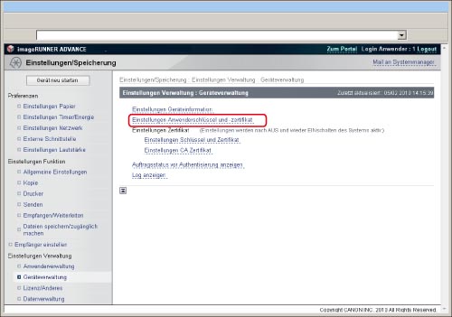 Klicken Sie auf [Einstellungen Anwenderschlüssel und -zertifikat].