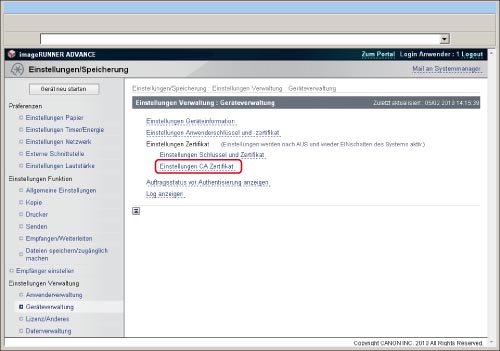 Installieren Sie die CA-Zertifikatdatei mit dem Remote UI. Die installierte CA-Zertifikatdatei kann als CA-Zertifikat installiert werden, indem Sie sie auf dem Bedienfeld des Systems registrieren.