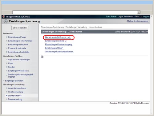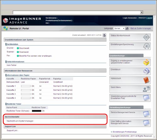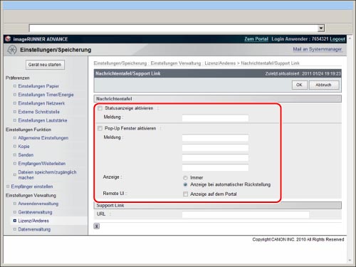 Wenn Sie [Anzeige auf dem Portal] wählen, wird das Message Board auf der Portalseite des Remote UI angezeigt.
