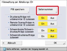 Wenn Sie eine Kontrollkarte verwenden, können Sie die Seitensummen auch prüfen, indem Sie nacheinander die Tasten [Status Monitor/Abbruch] → [Ressourcen] → [Seitenzähler prüfen] berühren.