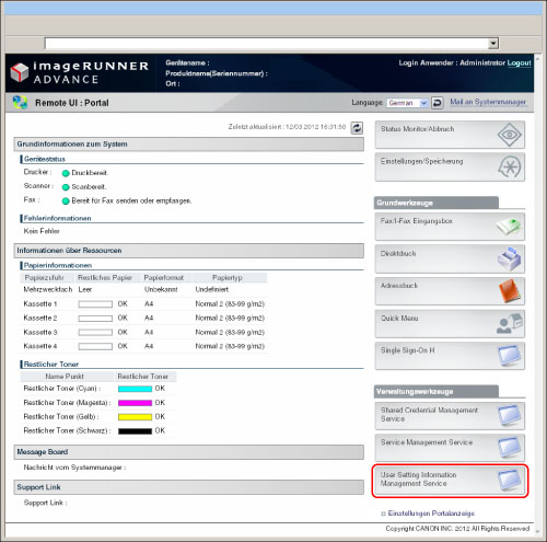 Um die einzelnen Einstellungen für <User Setting Information Management Service> festzulegen, müssen Sie vom Webbrowser aus auf das System zugreifen und sich bei ihm einloggen. Dieser Abschnitt beschreibt das Verfahren für den Zugriff auf das System von der Portalseite der Remote UI aus.
