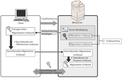 Wenn ein Anwender auf das System von seinem Computer aus zugreift, werden das SSL-Serverzertifikat und der öffentliche Schlüssel des Servers angefordert.