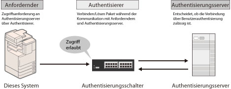 Diese Authentisierung erfolgt komplett über einen RADIUS-Authentisierungsserver (Remote Authentication Dial In User Service), wobei nur der Antragsteller authentisiert wird. Nur Antragsteller, die am RADIUS-Server authentisiert wurden, haben Zugriff auf das Netzwerk.