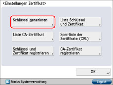 Berühren Sie nacheinander die Tasten [Einstellungen Verwaltung] → [Geräteverwaltung] → [Einstellungen Zertifikat].