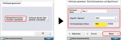 Berühren Sie die Taste [Netzwerkkommunikationsschl. generieren] → Definieren Sie die einzelnen Einstellungen → Berühren Sie die Taste [Weiter].