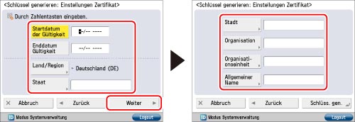 Richten Sie das selbstsignierte Serverzertifikat ein → Berühren Sie die Taste [Weiter] → Legen Sie die einzelnen Einstellungen fest.