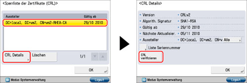 Wählen Sie die Sperrliste der Zertifikate für das zu verifizierende Zertifikat → Berühren Sie [CRL Details] → [CRL verifizieren].