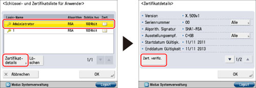 Wählen Sie das Schlüsselpaar für das Serverzertifikat, das Sie prüfen wollen → Berühren Sie nacheinander die Tasten [Zertifikatdetails] → [Zert. verifiz.].