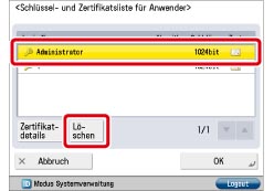 Wenn [Zert. verifiz.] gedimmt dargestellt oder <Schlüssel ist beschädigt oder ungültig.> angezeigt wird, können Sie das Schlüsselpaar nicht verwenden. Nach dem Löschen des Schlüsselpaars installieren Sie vom Computer aus ein neues Schlüsselpaar und ein Anwenderzertifikat.
