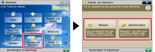 Berühren Sie zum Scannen und Speichern des Originals die Taste [Scannen und Speichern] auf dem Hauptmenüdisplay → Geben Sie den Ort für die Speicherung der gescannten Daten an.