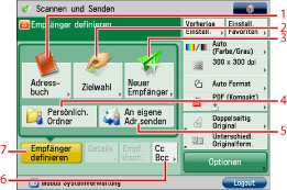 Wenn Sie im Hauptmenü die Taste [Scannen und Senden] berühren, wird das Grundfunktionendisplay zum Scannen und Senden angezeigt. Mit der Sendefunktionen können Sie Dokumente einscannen und per E-Mail oder I-Fax an angegebene Empfänger verschicken oder auf einem Dateiserver speichern. Auch ein Versand an mehrere Empfänger gleichzeitig ist über verschiedene Versandmethoden wie E-Mail oder I-Fax möglich.