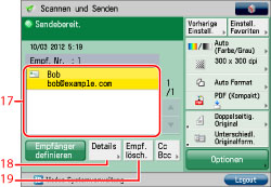 Zur Anzeige des Faxempfängers aktivieren Sie die Funktion <Fax in der Fkt. Scannen und Senden aktivieren> unter [Faxfunktion anzeigen]. (Vgl. Abschnitt "Faxfunktion anzeigen".)