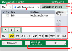 Berühren Sie die alphanumerischen Tasten (z. B. [ABC]), um die zugeordneten einzelnen Zeichen oder Ziffern anzuzeigen. Sie können die angezeigten Einträge eingrenzen, indem Sie einen Buchstaben oder eine Ziffer auswählen. Durch Berühren von [Alle] kehren Sie zur gesamten Adressenliste zurück.