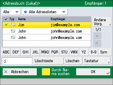 Zur weiteren Eingrenzung der Suche können Sie mehrere aufeinanderfolgende Buchstaben des Empfängernamens, beginnend mit dem ersten Buchstaben, eingeben. Sie können die angezeigten Adressen auch filtern, indem Sie die [Tastatur] verwenden, um mehrere Buchstaben einzugeben.