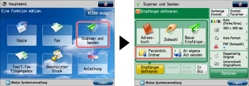 oben rechts auf dem Display → Berühren Sie dann [Info für jeden Anwend. speichern/bearbeiten] → [Persönlicher Ordner].Der Administrator kann die Empfänger für Dateiübertragungen an jeden persönlichen Ordner des allgemeinen Anwenders beschränken. (Vgl. Abschnitt "Empfänger für Dateiübertragung beschränken".)