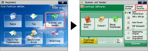 Berühren Sie nacheinander die Tasten [Scannen und Senden] → [Einstell. Favoriten].