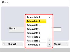 Der Anfangsbuchstabe des eingegebenen Namens wird zum Sortieren der Empfängerliste verwendet, wenn Sie auf dem Adressbuch-Display Tasten wie [ABC], [DEF] oder [GHI] berühren. Wenn Sie auf dem Adressbuch-Display die Taste [Durch Name suchen] berühren, wird ein Display zur Suche im Adressbuch angezeigt.