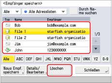 Wählen Sie den zu löschenden Empfänger → Berühren Sie die Taste [Löschen].