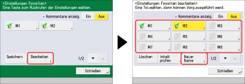 Berühren Sie die Taste [Bearbeiten] → Wählen Sie die Taste, deren Namen oder Kommentar Sie bearbeiten möchten → Berühren Sie die Taste [Neuer Name].
