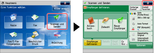 Berühren Sie nacheinander die Tasten [Scannen und Senden] →