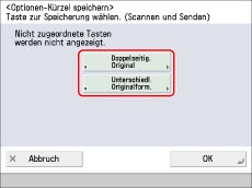 Es werden zwei Optionen-Kürzel auf dem Display zum Scannen und Senden angezeigt. Standardmäßig sind dies [Doppelseitig. Original] und [Unterschiedl. Originalform.]. Diese Kürzel können mit Funktionen belegt werden, die Sie häufig verwenden.