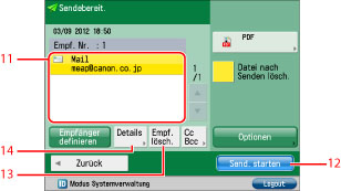 Berühren Sie diese Taste zum Definieren Ihrer eigenen E-Mail-Adresse als Empfänger. Der Administrator kann allgemeine Anwender darauf beschränken, E-mail nur zu ihren Adressen zu schicken. (Vgl. Abschnitt "Begrenzte Empfänger für Senden von E-Mail einstellen".)
