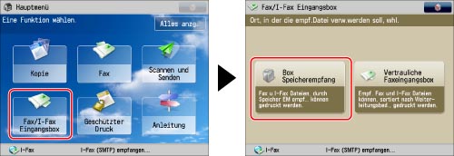 Berühren Sie nacheinander die Tasten [Fax/I-Fax Eingangsbox] → [Box Speicherempfang].