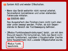 Wenn Sie <Modus Funktionsbeschränkungen> auf dem Display <Serviceruf-Meldung> aktivieren, wird [Modus Funktionsbeschränkungen] in [Einstellungen Verwaltung] (<Einstellungen/Speicherung>) ebenfalls auf 'Ein' gestellt. (Vgl. Abschnitt "Einschränken von Funktionen".)