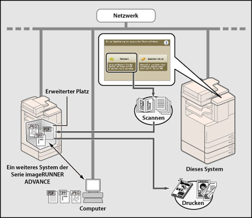 Durch Auswahl des Erweiterten Platzes auf einem anderen imageRUNNER ADVANCE-System über [Netzwerk] können Sie ein Dokument mit diesem System scannen und im Erweiterten Platz eines anderen imageRUNNER ADVANCE-Systems speichern. Sie können dieses System auch verwenden, um Dateien auszudrucken, die auf einem anderen imageRUNNER ADVANCE-System im Netzwerk gespeichert sind.