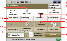 Berühren Sie diese Taste, um Scaneinstellungen abzurufen oder häufig verwendete Einstellungen in den <Einstellungen Favoriten> zu speichern. |