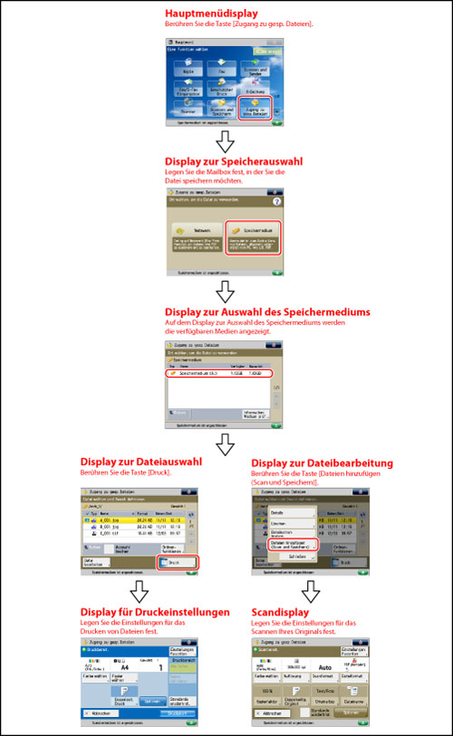 Informationen zum Vorgehen für die Funktion [Dateien hinzufügen (Scan und Speichern)] und Anweisungen zum Bedienen des Scandisplays finden Sie in den Abschnitten "Hinzufügen einer Datei (Scannen und Speichern)" und "Vorgehen beim Scannen und Speichern".