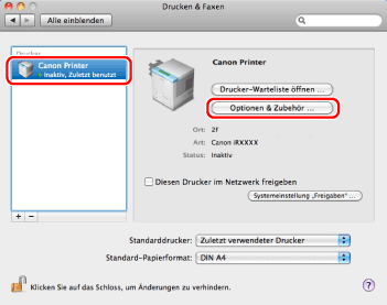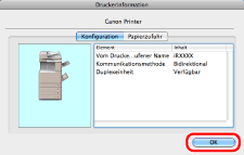 Wenn der oben im Dialogfenster [Druckerinformation] angezeigte Druckername und der unter [Vom Drucker abgerufener Name] angezeigte Druckername nicht übereinstimmen, können Sie die Druckerfunktionen eventuell nicht wie vorgesehen nutzen. Sollte dies der Fall sein, löschen Sie den in den [Systemeinstellungen] hinzugefügten Drucker und fügen Sie ihn erneut hinzu. Nähere Informationen finden Sie im Printer Driver Installation Guide (vgl. " Installation").
