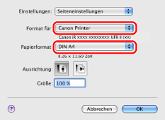 Je nach verwendeter Anwendung wird das Dialogfenster [Papierformat] unter Mac OS X 10.5 oder höher möglicherweise nicht angezeigt. Wenn dies der Fall ist, können Sie die folgenden Einstellungen aus dem Dialogfenster [Papierformat] festlegen. Dieses erreichen Sie, indem Sie im Menü [Ablage] die Option [Drucken] auswählen.
