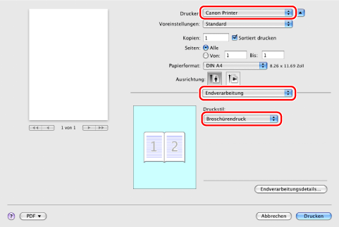 Wählen Sie den Drucker aus → [Endverarbeitung] → Wählen Sie unter [Druckstil] die Option [Broschürendruck].