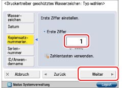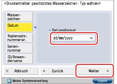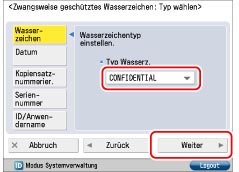 Berühren Sie die Auswahlliste → Wählen Sie den Typ des Wasserzeichens → Berühren Sie die Taste [Weiter].