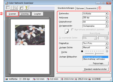 Legen Sie die Einstellungen für Farbmodus, Auflösung, Papierauflage usw. fest.