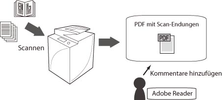 Wenn Sie bei der Konvertierung eines Papierdokuments in eine PDF-Datei die Option Scan-Endungen wählen, können Sie Kommentare hinzufügen/bearbeiten und mit Adobe Reader (Adobe Reader 7 oder höher) Signaturen hinzufügen.