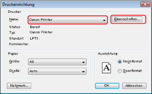 Wählen Sie im Menü [Datei] der Anwendungssoftware, die Sie zum Drucken des Dokumentes verwenden, die Option [Drucken] → Das Dialogfeld [Druckeinrichtung] wird angezeigt → Klicken Sie auf [Eigenschaften].