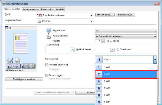 Wählen Sie auf der Registerkarte [Seite einrichten] aus der Auswahlliste [Seitenlayout] die Option [2 auf 1] aus.