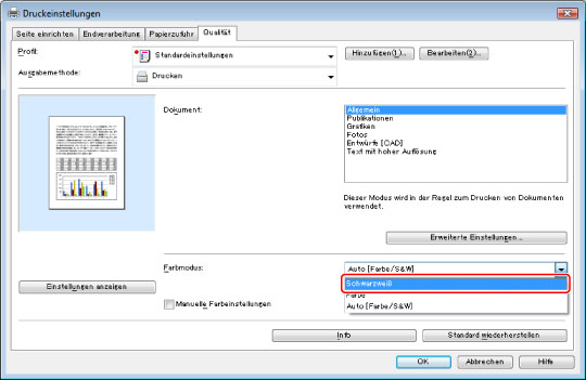 Wählen Sie auf der Registerkarte [Qualität] aus der Auswahlliste [Farbmodus] die Option [Schwarzweiß].