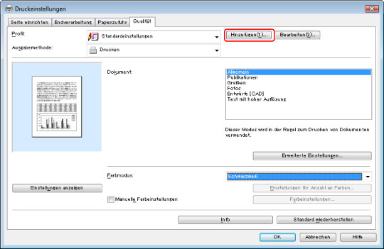 Druckertreibereinstellungen für unterschiedliche Arten von Druckjobs sind standardmäßig als Profile vorgespeichert. Sie können so Druckeinstellungen für den jeweiligen Zweck durch Auswählen eines der Profile vorgeben. Darüber hinaus können Sie zusätzlich zu den Standardeinstellungen eigene häufig verwendete Einstellungen in Form von Profilen speichern.