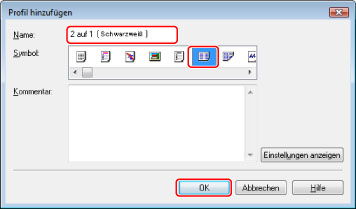 Geben Sie einen Namen wie z. B. '2 pages/sheet (B&W)' unter [Name] ein → Wählen Sie [