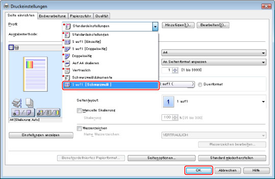 Wählen Sie in der Auswahlliste [Profil] den Eintrag [2 pages/sheet (B&W)] → Klicken Sie auf [OK].